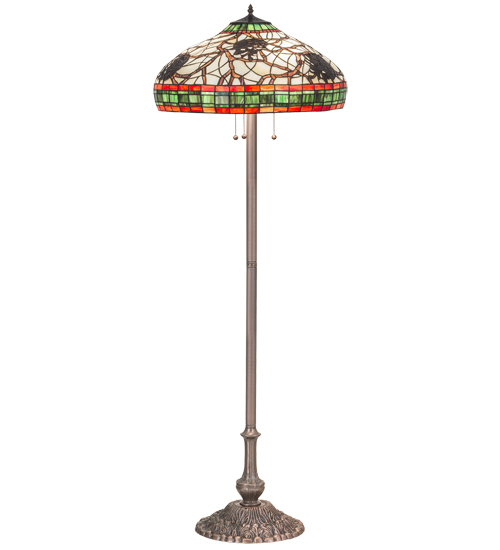 This stunning design features the iconic pinecone, one of Mother Nature's most compelling organic symbols, which offers a natural elegance and represents the evolution of human enlightenment. Burgundy and Leaf Green bands edge this woodland shade that highlights Light Brown pinecones and Golden Sun branches on a Beige art glass shade. The art glass shade, which is created using the famous Meyda Tiffany copperfoil construction process, is enhanced with a floor base finished in Mahogany Bronze. UL and cUL Listed for dry locations.