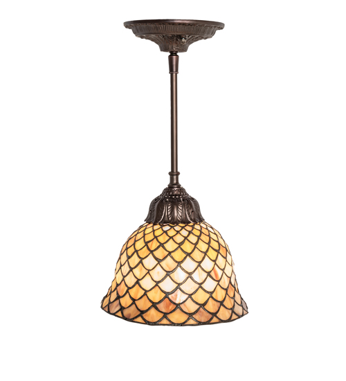 A Louis Comfort Tiffany studio classic... The renowned Fishscale design features a variegated Tortoiseshell of Emerald, Sapphire, Mauve, and beige-colored stained glass, evoking a unique, dimensional, and textured look in a rainbow of brilliant hues. This exquisite stained glass shade is created using the famous Meyda Tiffany copper foil construction process and complemented with Mahogany Bronze hand-finished hardware. The overall height can be adjusted by combining the four stem lengths that are included: 6-inch, 12-inch, 16-inch, and 24-inch, in any combination to achieve the desired drop from the ceiling. The Tiffany Fishscale Mini Pendant is included in our American-designed Tiffany Reproduction Lighting Collection. The fixture is UL and cUL listed for use in dry and damp locations. Each shade is a unique work of art, featuring color variations derived from the natural ingredients inherent in the glass.