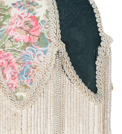 Natural forms and fabric come to light with this beautiful fabric shade. Soft Ivory Pink and Blue Tulips are featured on this damask-styled fabric edged in long strands of Clear Glass Beaded Fringe. Each colorful fabric floral petal is contrasted with Hunter Green panels. This shade pairs well with a Vanity Tray base to create a 19-inch High Fabric Tulip Lighted Vanity Tray Lamp, model 267782, as well as ceiling pendants. The Tulip W/Fringe Fabric Shade is included in our American-designed, handcrafted Fabric & Fringe Collection.