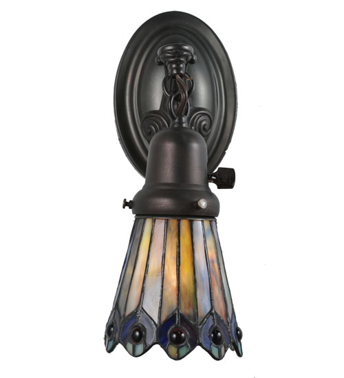As distinctive as beautiful Peacock fanning feathers in the wild, no two shades will ever be the same as their individuality can be as remarkably unique as their personality. This artistic creation utilizes swirling opalescent art glass background combinations including Beige, Yellow Pinks, Golden Greens, Ivories, Bluish Whites, Turquoise Blues, Olive and Spring Greens. The eye of the plumage design reveals Purples, Pastel Blues, Teals, Cobalt and Ivories, accented with Blue and Purple colored jewels. Individual pieces of glass are hand cut and wrapped using Meyda Tiffany's famous copperfoil construction. Each shade is a unique work of art with color variations based on natural ingredients inherent in the glass. Craftsman Brown finish.