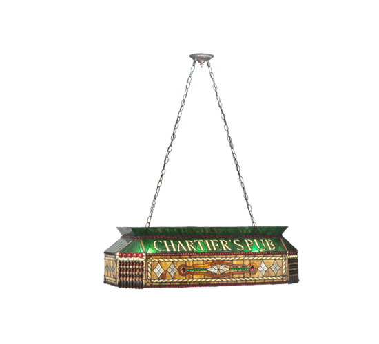 Offer a stunning stained glass design, this beautiful oblong pendant features the Chartier's Pub name in White lettering on Emerald Green art glass, which is complemented with a Dark Beige background. This art nouveau design features diamond-shaped designs and rows of Green, Red, Clear, and Amber glass jewels throughout the shade, which was constructed using the famous Meyda Tiffany construction technique a rhapsody of geometric shapes and stunning colors. The fixture is enhanced with a Mahogany Bronze finished hardware. The overall height ranges from 19 to 50 inches, as the suspension chain can be easily adjusted in the field to meet your lighting requirements. The oblong pendant is ideal for illuminating billiard tables, bars, islands, counters, and dining tables in residential and hospitality locations. The Personalized Chartier's Pub Oblong Pendant is featured in our American-designed, handcrafted Personalized Lighting Collection and manufactured in Yorkville, New York. UL and cUL listed for dry and damp locations. This personalized item is shown as an example of our craftsmanship and is not for sale 'as is' but can be customized to fit your needs.