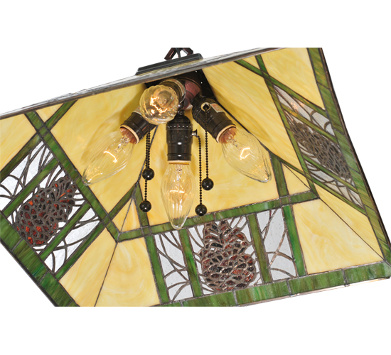 This charming nature inspired fixture features a Mission designed shade with Bark Brown granite glass Pinecones on a Clear granite glass background. Bone Beige stained glass is geometrically divided by Burgundy and Moss Green bands on shades, suspended by hardware hand finished in Mahogany Bronze. Custom sizes, styles, colors and dimmable energy efficient lamping are available. UL and cUL listed for dry and damp locations.