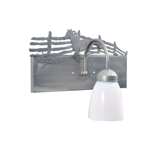 A wild steed galloping in his corral is dramatically captured in this bold eyecatching design. Hand finished in handsome Steel, this wall sconce features an Opal White glass shade. Handcrafted by Meyda artisans in the Yorkville, New York manufacturing facilities.