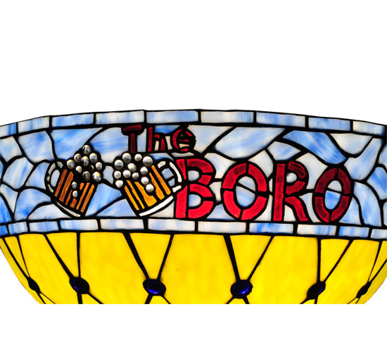 This custom pendant features Beige art glass crowned with Blue mosaic styled art glass and accented with vine like detailing and glass jewels. Handcrafted using the Meyda Tiffany copper foil construction process. The overall height ranges from 33 to 62 inches, as the chain adjusts on location. Included in our American-designed, handcrafted Personalized Stained Glass Lighting Collection. Custom made. Call for cost and lead time.