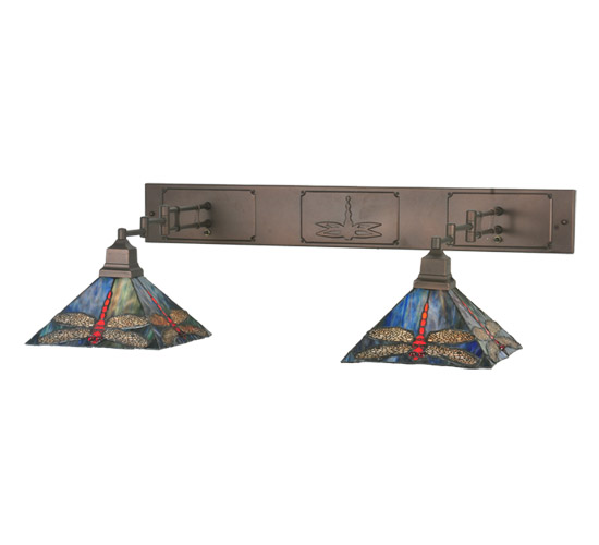 Scarlet Dragonflies with Ruby eyes dive downward against a cloud filled Aurora Midnight sky streaked with a full spectrum of colors on two art glass shades which are created using the famous Meyda Tiffany copperfoil construction. The Mission style square shades are suspended from two Mahogany Bronze finished Swing Arms that embrace a Dragonfly designed backplate. Total width ranges from 36 to 55 inches and the total depth ranges from 14 to 23 inches as swing arms adjust. UL and cUL listed for dry and damp locations. Each shade is a unique work of art with color variations based on natural ingredients inherent in the glass. Contact us if color matching is critical when ordering multiple items.
