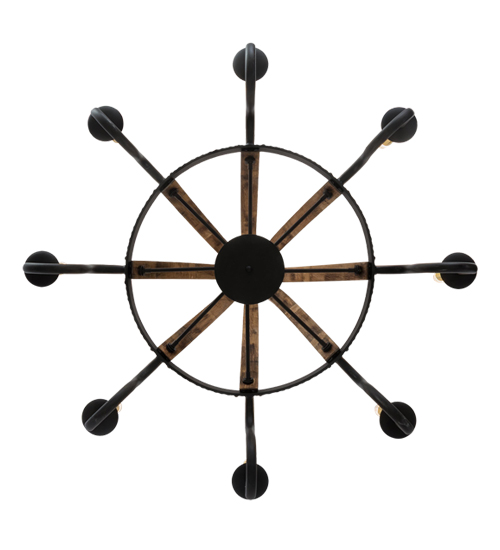 Rustic charm and Gothic beauty are combined to create this handsome fixture which is ideal for an inn, home, restaurant, retail shop and many other locations. Delicate faux candles suspend from graceful arms attached to a unique wheel-like hub. Hand finished in Costello Black and Antique Wood. Custom crafted in upstate New York. Includes canopy with 2.5 feet of chain and four feet of wire. UL listed for damp locations