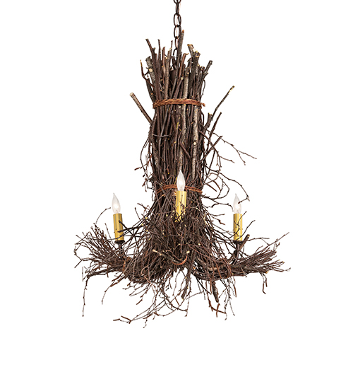 Bring Mother Nature into your home with Natural Hickory and Birchwood twigs and branches intertwined and designed to create the elaborate structure of this unique chandelier. Perfect for restaurant, inn, lodge and retail applications as well. Replica wax candles light up this rustic fixture, crafted with meticulous attention to detail by the skillful hands of Meyda artisans in the foothills of the Adirondack Mountains in Upstate New York. Hardware is hand finished in Mahogany Bronze. Includes canopy, 2.5 feet of chain and four feet of wire. Energy efficient lamping options available. UL listed for damp locations.