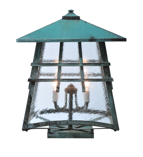This Meyda Craftsman Signature fixture is perfect to illuminate exterior spaces for homes, hotels, clubs and other spaces where handsome outdoor lanterns are needed. Hand finished in a striking Verdigris finish that complements Clear Seedy glass. Made in the USA. Energy efficient lamping options available. UL listed for wet locations.