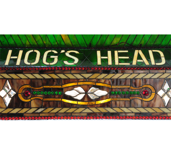 Offering a stunning stained glass design, this beautiful oblong pendant features the Hog's Head name in White lettering on an Emerald Green art glass, which is complemented by a Dark Beige background. This art nouveau design features diamond-shaped designs and rows of Green, Red, Clear, and Amber glass jewels throughout the shade, which was created using the famous Meyda Tiffany construction technique. The shade features a rhapsody of geometric shapes and stunning colors and is enhanced with a Mahogany Bronze finished hardware. The overall height ranges from 19 to 50 inches, as the suspension chain can be easily adjusted in the field to meet your lighting requirements. The oblong pendant is ideal for illuminating billiard tables, bars, islands, counters, and dining tables in residential and hospitality locations. The Personalized Hog's Head Oblong Pendant is included in our American-designed, handcrafted Personalized Lighting Collection and manufactured in Yorkville, New York. UL and cUL listed for dry and damp locations. This personalized item is shown as an example of our craftsmanship and is not for sale 'as is' but can be customized to fit your needs.