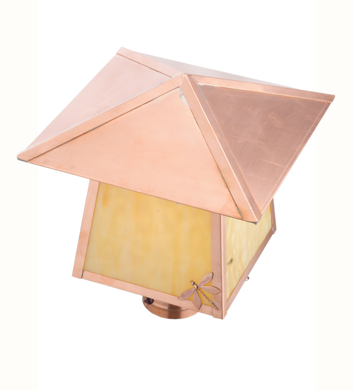 A solitary Dragonfly accents the edge of this handsome American Craftsman post mount lantern.The handsome fixtures finished in Natural Copper and designed with stunning Beige art glass panels.Ideal for illuminating landscapes, patios, porches, parking lots, street paths, and for a broad range of outdoor applications.Meyda's Stillwater Dragonfly is handcrafted in the USA by highly skilled Meyda artisans.UL Listed for wet locations