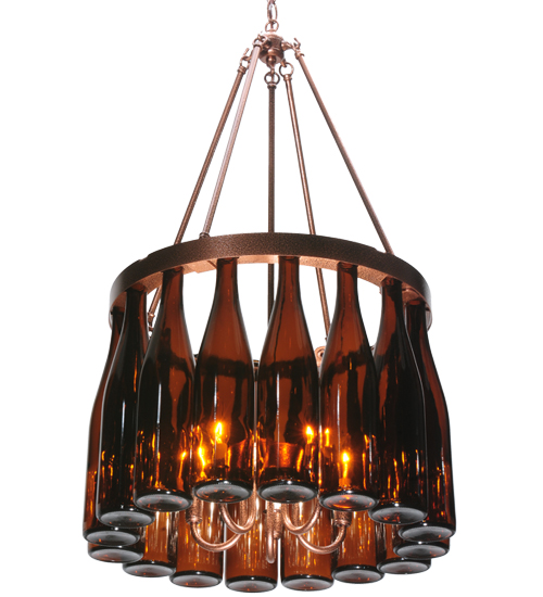 Capture the life of the party with the whimsical design of the Meyda Wine Bottle Chandelier. So much fun that you may want to hang from it, but don't! Liven up a restaurant, club or home with a chandelier that does so much more than deliver light; it adds personality and pizzazz. Sixteen Chardonnay bottles are suspended from a Copper Vein finished rim with five arms. Handcrafted in the USA by Meyda artisans in the USA. Custom options available.