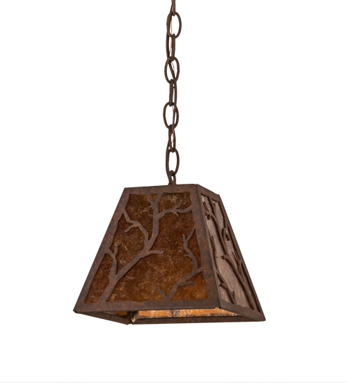 An appealing elaborate ceiling pendant design features tree branches that appear dramatically stark in the cold winter sunlight. The stunning Amber Mica shade is complemented with a frame and hardware featured in a Rusty Nail finish. Handcrafted in our manufacturing facility in Upstate New York, custom options include special sizes, finishes and designs, as well as dimmable energy efficient lamping options such as LED. The pendant is UL and cUL listed for dry and damp locations.