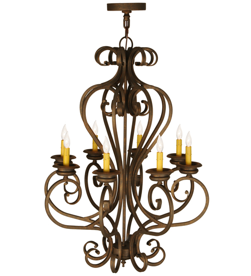 Beauty and grace come to light with this elegant chandelier highlighted with an elaborate scroll design. 8 Amber faux candlelights are perched on distinctive bobeches featured in a tasteful French Bronze finish. Perfect to illuminate nearly any room in fine homes, hotels, restaurants and other residential and commercial spaces. This classic decorative lighting fixture complements any interior design. Handcrafted in our manufacturing facilities in the USA, Fernando is available in a variety of custom sizes, finishes and dimmable energy efficient lamping options such as LED. The 28-inch wide chandelier is UL and cUL listed for damp and dry locations.