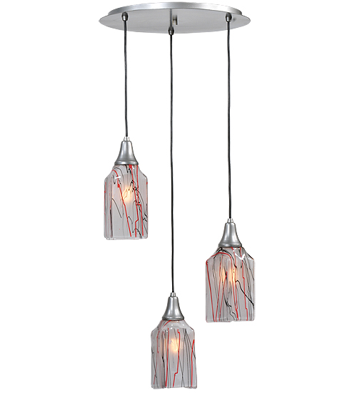 A sweet design with a mouth-watering fused glass lighting effect, the Licorice mini pendant has a cool look created from hot, high-fired glass and is designed to fall into a draped art glass shape. Licorice Black and Red streaks are highlighted against a Clear Glass Background. The three fused glass shades are complemented with Brass hardware featured in a Nickel finish. This pendant is perfect for illuminating open or spiral staircases, entryways, and other rooms in fine homes and hotels from Shelter Island, New York, to Columbus, Ohio, to Palm Springs, California. The Metro Fusion Licorice Cascading is included in our American-made, American-designed, handcrafted Fused Glass Collection, which is manufactured in Yorkville, New York. UL and cUL listed for dry and damp locations. Each shade is a unique work of art with color variations based on natural ingredients inherent in the glass. The Quality Bent Glass division of Meyda Lighting is over 100 years in the making. Today, we are still creating timeless masterpieces using tools and methods from the days when we supplied Tiffany Studios. Fused glass colors and metal finishes are customizable, as each fixture is handcrafted to order.