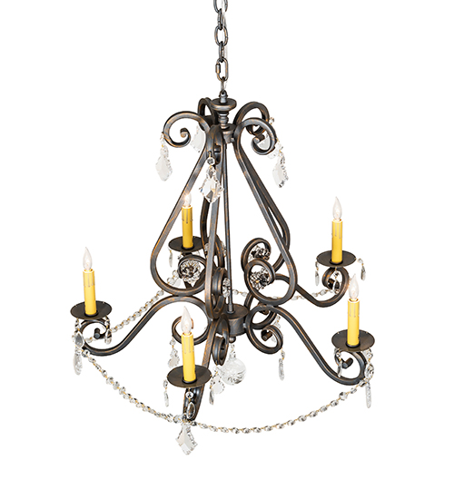 Offering luxurious charm and elegance, Adrianna features an elaborate design with Hand Forged Iron Scrolled arms and accents in a stunning French Bronze finish. The exquisite chandelier reveals 5 Ivory faux candlelights perched on bobeches and adorned with crystal droplets, medallions and garland. Custom crafted in the USA, this gorgeous chandelier is available in custom sizes, styles and colors, as well as dimmable energy efficient lamping options such as LED. The 26-inch wide chandelier is UL and cUL listed for damp and dry locations.