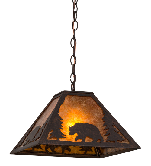 Drawing inspiration from the wildlife and natural beauty in the spectacular Adirondack Mountains nearby, this stunning steel fixture depicts a bold Bear meandering through the woodlands. Beautiful ambient light is evoked through Amber Mica, which is complemented with a frame, decorative accents and hardware featured in a Cajun Spice finish. The rustic styled pendant is handcrafted artisans in our Yorkville, NY facility. Custom designs, styles and sizes are available, as well as dimmable energy efficient lamping options. The fixture is UL and cUL listed for damp and dry locations.