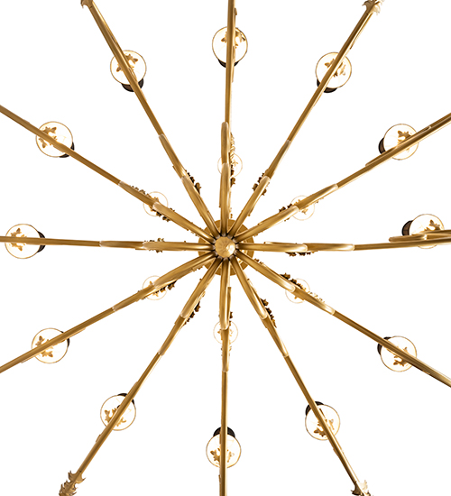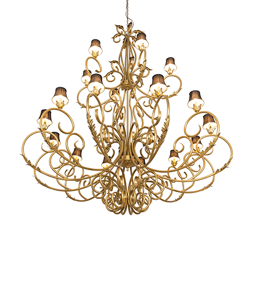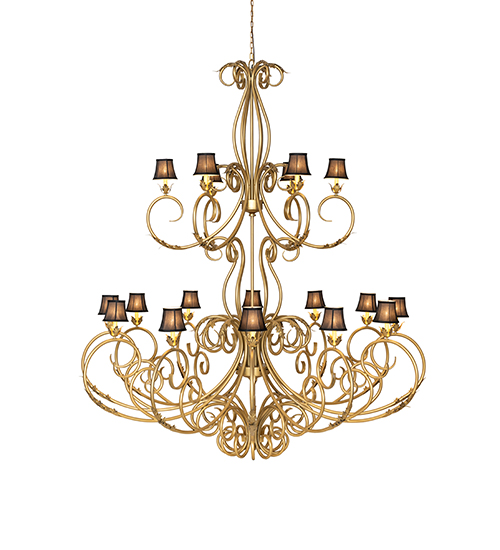 Defining luxurious charm and elegance, Alexandria features an elaborate design with scrolled arms and acanthus leaf accents in a stunning Spanish Gold finish. Two tiers of graceful faux candlelights crowned with Black Trumpet Shades, 18 in total, are perched on floral bobeches. American artistry is perfected by years of time honored artistry, passed down generations of master artisans. Custom crafted in the USA, this chandelier is available in custom sizes, styles, and colors, as well as dimmable energy efficient lamping options. This 84-inch wide fixture is UL and cUL listed for dry and damp locations however we do not recommend installing it in spaces that experience a large amount of moisture.