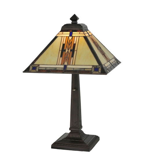 This Nuevo Mission lamp features a shade with a Sand tone Beige background with glistened Honey, Mauve and Root Brown interlocking tiles. This shade is bordered with Root Brown Granite Glass, Opal Brown and Mauve with Blue Opal Waterglass medallions. The stunning shade is created using the famous Meyda Tiffany copperfoil construction method. The shade is paired with a Mahogany Bronze finished base. UL and cUL listed for dry locations.