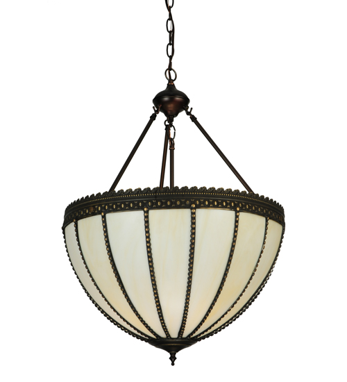 Invite rich Gothic beauty and Old World charm into any home, hotel, restaurant, retail or commercial space. Beige art glass panels are wrapped with brass channel then soldered together. The art glass shade is accented with Craftsman Brown finished beaded trim and matching beaded accents on top of the shade. Custom colors, sizes and styles available. Energy efficient lamping options offered. Handcrafted in the Meyda manufacturing facilities by highly skilled artisans in Upstate New York.