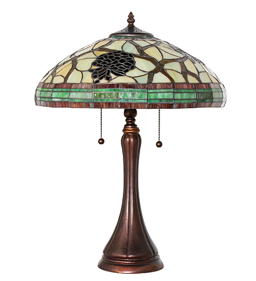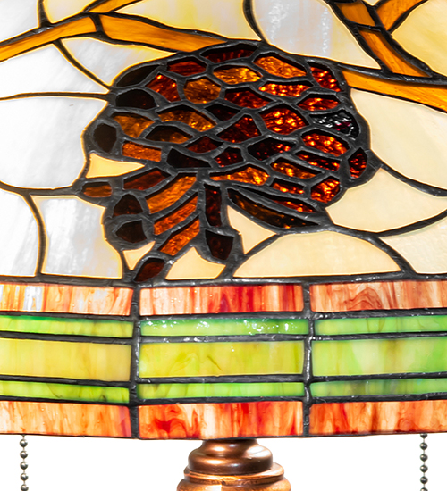 This stunning art glass design features the iconic Pinecone, one of Mother Nature's most compelling organic symbols, which offers natural elegance and represents the evolution of human enlightenment. Burgundy and Leaf Green bands edge this woodland shade, highlighting Light Brown pinecones and Golden Sun branches on a Beige art glass shade. The beautiful shade is created using the famous Meyda Tiffany copperfoil construction technique and complemented with a Mahogany Bronze finished base. Inspired by Pine Trees in renowned American forests, including Deschutes National Forest in central Oregon, Sierra National Forest in the Nevada-Sierra National Forest, and the White Mountain Forest, New Hampshire. The Pinecone Mission Mini Lamp is included in our American-designed, handcrafted Nature Inspired Stained Glass Collection. UL and cUL listed for dry locations.