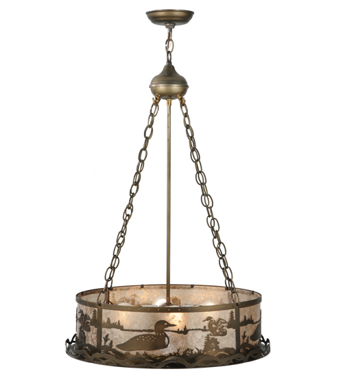 This wildlife inspired pendant features aquatic birds floating on a mountain lake as the morning sun rises in the background. Beautiful ambient light shines through Silver Mica lens and bottom diffuser, complemented with a frame and hardware hand finished in Antique Copper.Handmade by Meyda Craftsmen in the Yorkville, NY manufacturing facility located at the foothills of the Adirondack Mountains. Custom colors, styles and sizes available. Energy efficient lamping options.