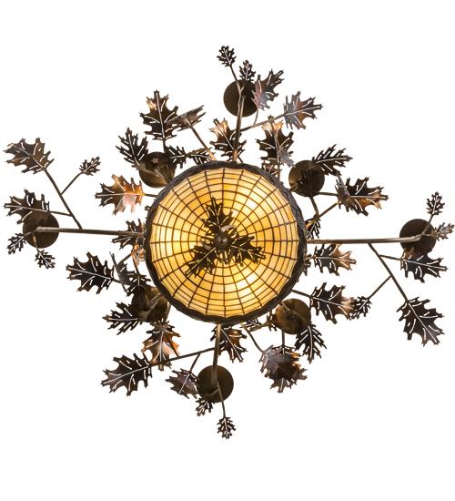 This eye-catching chandelier in a Dark Burnished Antique Copper finish is as majestic as the mighty oak. The stained glass shade delights with Autumnal Beige Art glass with a Bark Brown and Blue and Purple Granite Textured Glass crown sprouting oak leaf-covered hardware that is handmade by Meyda artisans. The shade is created using the famous Meyda Tiffany copperfoil construction process. Overall height ranges from 29 to 59 inches as the chain can be easily adjusted in the field. The Greenbriar Oak Chandelier is included in our American-made, American-designed, handcrafted Greenbriar Collection. Manufactured in Yorkville, New York. UL and cUL listed for dry and damp locations. No two art glass shades will be the same.