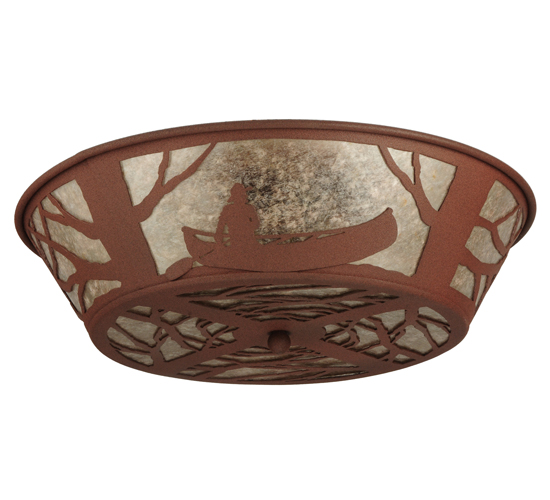 A handsome but serene design that depicts a sportsman paddling his canoe down a gentle mountain stream. This round ceiling fixture features an inverted Silver Mica shade that is enhanced with a frame and decorative accents in a stunning Rust finish. The ceiling fixture is ideal for beautiful ambient illumination above a table or island in your home, lodge, restaurant, or business. The Canoe at Lake Flushmount is included in our American-made, American-designed, handcrafted Sporting Life Collection. Manufactured in Yorkville, New York. UL and cUL listed for dry and damp locations.