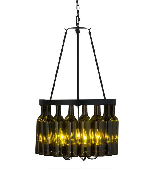 Capture the life of any party with authentic wine bottle lighting... so much fun that you may want to hang from this chandelier, but don't. The fixture does so much more than deliver light; it adds personality and pizazz to any interior. Perfect for homes, restaurants, hotels, pubs, nightclubs, wineries, and retailers. Custom crafted with 16 authentic Antique Green glass wine bottles, which are attached to sturdy hardware featured in a Black finish. The fixture is handmade by Meyda artisans in our manufacturing facilities in upstate New York. Custom colors, styles and sizes area available. Energy efficient lamping options are offered. The fixture is UL and cUL listed.