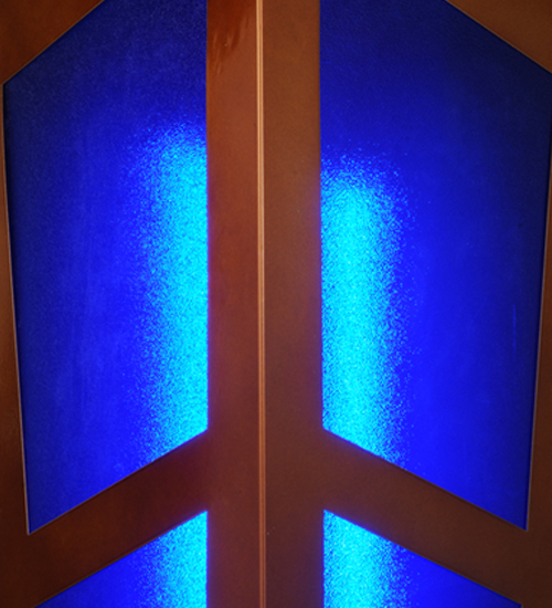 Brilliant Sapphire Idalight insets comprise a stylized design that highlights this bold, dramatic Polaris wall fixture for residential, nightclub, restaurant, and commercial applications. Hand-finished in Transparent Copper, this stunning extensive sconce can accent a club washroom, a boutique hotel hallway, or a retail facade. Integral LEDs provide brilliant illumination, energy efficiency, and long life. The Polaris Wall Sconce is included in our American-made, American-designed, handmade Modern Lighting Collection and manufactured in Yorkville, NY. UL & cUL listed for dry, damp, and wet locations.