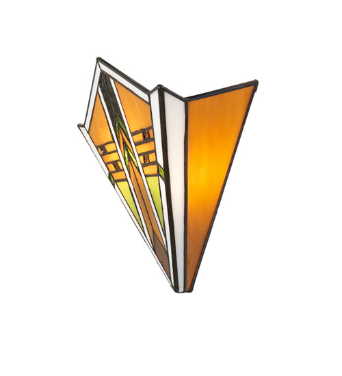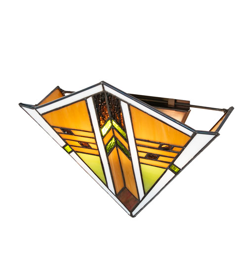 Offering a unique and handsome Mission design, Abilene depicts colorful arrowheads of Green and Amber on a multi-designed motif of linear locks of Green and Amber, highlighted with Yellow and Amber Jewels. The handcrafted stained glass shade, which features a Mission design that interprets organic objects into geometric forms, is framed in White glass and was created using Meyda Tiffany's famous copperfoil construction process.