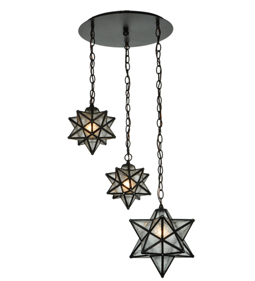 Grace your home with this timeless cascading ceiling pendant. Dating back to Moravia hundreds of years ago, the Star was used to protect your home and bring good luck to your family. Three sparkling Clear Seeded Glass shades are suspended at various heights to create a dramatic design statement for lobbies, entryways and other spaces in residential, hospitality and commercial settings. Each shade is created with Brass Channel Construction and complemented with a Craftsman Brown finish. Overall height ranges from 16 to 76 inches as the chain length can be easily adjusted in the field. Shade colors, metal finishes and sizes can be customized to your lighting needs. UL and cUL listed for dry, damp and wet locations.