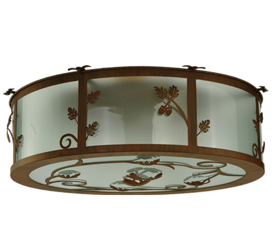 A distinctive charm is revealed with this elegant, nature inspired design. Rust finished Oak Leaves and Acorns adorn a Frosted Seeded Glass curvaceous shade with a matching bottom diffuser. A stunning design, the Oak symbolizes strength, endurance, eternity, honor, hospitality and virtue. The Oak Leaf & Acorn Flushmount is Domestically manufactured in our 180,000 square foot facility in Yorkville, New York. Customize shade colors, metal finishes and fixture sizes to suit your taste. UL and cUL listed for dry and damp locations.