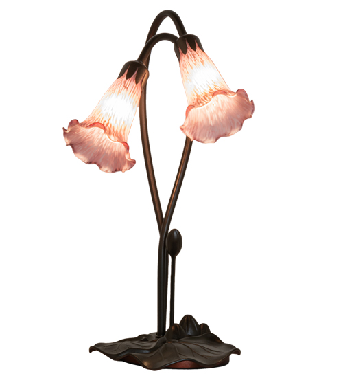 One of the most popular Louis Comfort Tiffany styled lamps on the market today, recreating his famous Favrile design from the early 1900's. This softly mottled Lavender fluted shaded Two Light Accent Lamp offers an attractive, delicate design featuring shades mouth blown of fine art glass. Lily shades are suspended from stems delicately winding above Lily pads bases finished by hand in Mahogany Bronze.