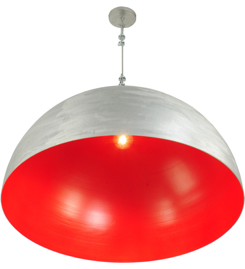 A cool curvaceous styled pendant, Gravity features a dome-shaped Aluminum shade offered in a Brushed Aluminum finish strikingly set on the outer surface and amazingly contrasting against a Red Powdercoat internal metallic finish. The richly appointed interior results in a warm, burnished glow. The Gravity Pendant is included in our American-made, American-designed, handcrafted Industrial Lighting Collection and manufactured in Yorkville, NY. UL & cUL listed for dry and damp locations. Featured in Stone Brewing World Bistro & Gardens, San Diego, CA. This item utilizes a unique mounting and wiring configuration designed specifically for a previous customer. Contact us for a quote. Otherwise, order item 180677 for a more standard mounting configuration.