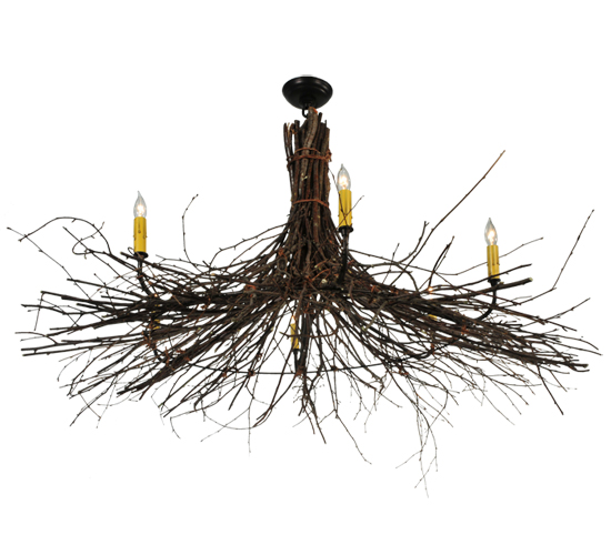 Meyda artisanship embraces Mother Nature. 6 Ivory faux candlelights appear to bud and grow from Twigs and branches. Twigs are hand selected and sustainably harvested by lightly pruning trees from the Adirondack mountains. All natural materials are hand woven around a metal frame suspended from the ceiling and enhanced with a Mahogany Bronze finish. The overall height ranges from 33 to 68 inches, as the chain length can be easily adjusted in the field. The Twigs Chandelier is included in our American-made, American-designed, handcrafted Mountain Harvest Collection. Manufactured in Yorkville, NY. UL & cUL listed for dry and damp locations.