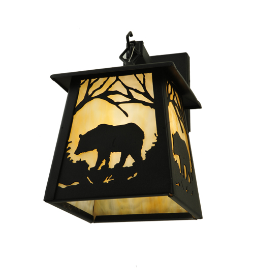 The call of the wild comes to light with a majestic Bear roaming through the woodlands while the morning sun rises in the background. Beautiful ambient light shines through the beautiful Beige Art Glass lens while the fixture is enhanced with decorative accents and hardware featured in a Textured Black finish. This wall sconce can be installed on walls in corridors and entryways in residential, hospitality, and commercial spaces. The Bear at Dawn Hanging Wall Sconce is featured in our American-made, American-designed, handcrafted Wildlife Lighting Collection. This fixture is manufactured in Yorkville, New York. It is UL and cUL listed for dry and damp locations. Upstate New York's adventurous playland, known as the Adirondack Mountains, with its many breathtaking forests, lakes, and rivers, is the spiritual birthplace of Meyda and inspires our rustic-themed art glass collections.