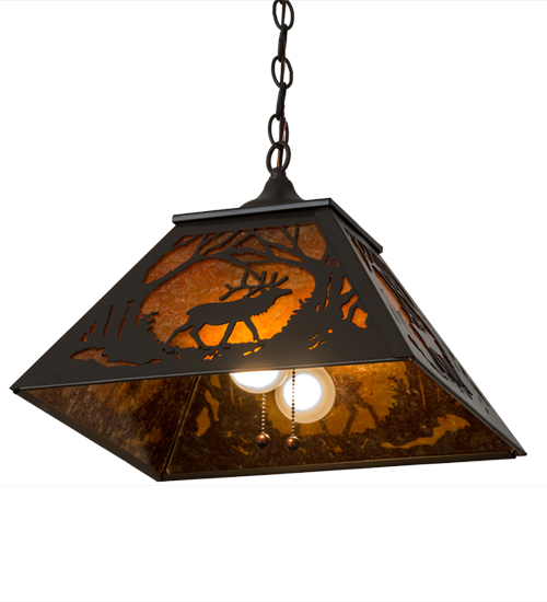 Up at dawn, a majestic Elk marks the terrain and walks with the whispering wind among the rim rocks and pine. Glimpse the hoof, patch of hide and antler horn as this charming power animal is captured beautifully while the brilliant morning sun rises above the forest. Beautiful ambient light radiates through stunning Amber Mica, which is complemented with decorative accents and hardware featured in a distinctive Timeless Bronze finish. The nature-inspired pendant is handcrafted by Meyda artisans in our American manufacturing facility at the foothills of the breathtaking Adirondack Mountains. An endless palette of custom sizes, styles, colors and lamping options are available. This fixture is UL and cUL listed for damp and dry locations.