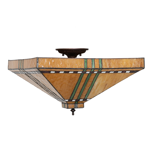 With a love of geometric forms, this lighting design interprets organic objects into simplified lines. The Prairie Corn ceiling fixture features an inverted shade with rows of Chili Red and Wheat kernels and stalks of Bronzed Jade against a Maize Gold background. The art glass shade is created using the famous Meyda Tiffany copperfoil construction and enhanced with a Mahogany Bronze finish. The Prairie Corn Flushmount is featured in our American-designed, handcrafted Mission Lighting Collection. UL and cUL listed for dry and damp locations. Each shade is a unique work of art with color variations based on natural ingredients inherent in the glass.