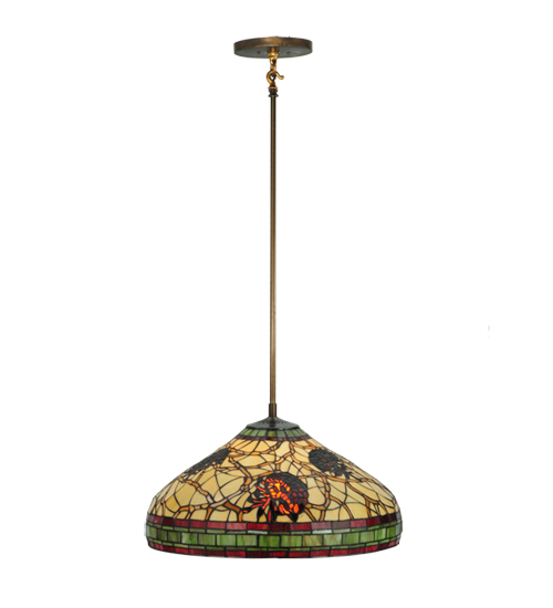 This stunning design features the iconic pinecone, one of Mother Nature's most compelling organic symbols. The pendant offers a natural elegance and represents the evolution of human enlightenment. Burgundy and Leaf Green bands edge this woodland art glass shade that highlights Bark Brown Pinecones and Branches on a Golden Sun background. The shade is created using the famous Meyda Tiffany copperfoil construction process and is complemented with an Antique Copper finish. Each shade is a unique work of art with color variations based on natural ingredients inherent in the glass. Contact us if color matching is critical when ordering multiple items.