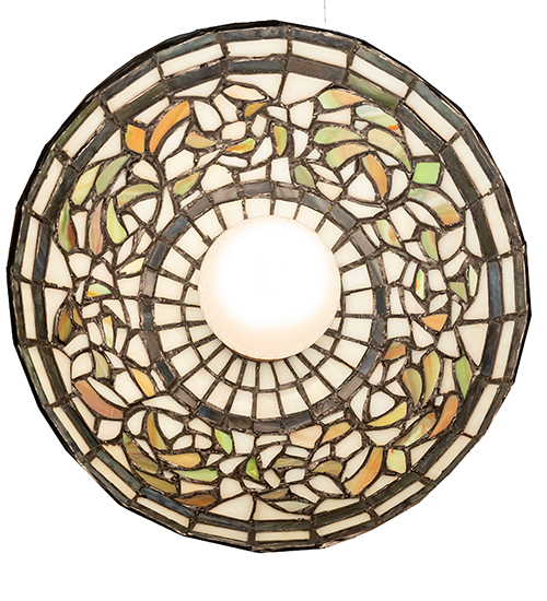 Autumn Gold, Russet, and Moss Green leaves swirl against an Amber Mauve background, enhanced with bands of Purple, Blue, and Green. The charming shade is created using the famous Meyda Tiffany copperfoil construction and complemented with elegant cast metal hardware in Mahogany Bronze. The overall height can be adjusted by combining the four stem lengths that are included: 6-inch, 12-inch, 16-inch, and 24-inch, in any combination to achieve the desired drop from the ceiling. The Tiffany Turning Leaf Mini Pendant is featured in our American-designed, handcrafted Tiffany Reproduction Collection and can be installed in a row over an island, bar, counter, or table to make an impressive statement. UL and cUL listed for dry and damp locations. Each shade is a unique work of art, featuring color variations derived from the natural ingredients inherent in the glass.