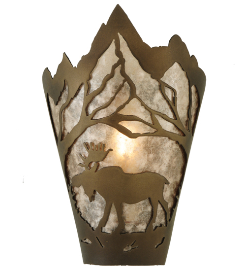 Bring natural beauty into your home with this majestic Moose meandering through the woodlands. This wildlife-adorned sconce is artistically designed with a stunning Silver Mica lens and a jagged edge featuring an Antique Copper finish. This handsome fixture will warm your home and your heart. Perfect for illuminating the walls in hallways, dining areas, and spaces in residential, hospitality, and commercial settings. This wall fixture is complemented with the matching 8" Wide Moose at Dawn Right Wall Sconce, model 136672. The Moose at Dawn Wall Sconces are included in our American-made, American-designed, handmade Wildlife Lighting Collection and are manufactured in the USA. UL and cUL listed for dry and damp locations. Upstate New York's adventurous playland,The Adirondack Mountains, with their many breathtaking forests, lakes, and rivers, are the spiritual birthplace of Meyda and inspire our rustic-themed mica collections.