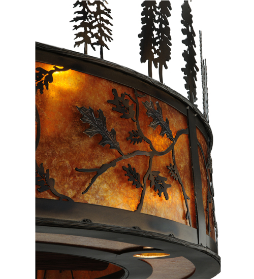 Designed with the bold Black Dog Lodge name, logo, and establishment year. This handsome Personalized Chandel-Air features an integrated ceiling fan while illuminating your interiors. The logo, Oak leaf design, and Tall Pine silhouettes are featured in a Burnished Antique Copper finish around a stunning Amber Mica Lens. Four downlights provide task lighting, four uplights deliver ambient illumination on the ceiling above, and 12 inner lights bring out the beauty of the mica. The decorative, uplights, downlights, and fan benefit from four separate circuits to give you precise dimming control over the three layers of light and the ceiling fan to create the perfect ambiance in the space. In summer, the fan pushes down a wind chill that circulates to keep the space cool & comfortable. In winter, the fan is reversed to pull the room air towards the ceiling, force warm air down, and circulate to create warmth. The Personalized Black Dog Lodge Chandel-Air is included in our American-made, American-designed, handcrafted Personalized Lighting Collection and manufactured in Yorkville, New York. UL and cUL are listed for dry and damp locations. This fan-integrated lighting fixture can be ordered by calling us and adding your own business or camp name for your next project. Please call for pricing and lead time.