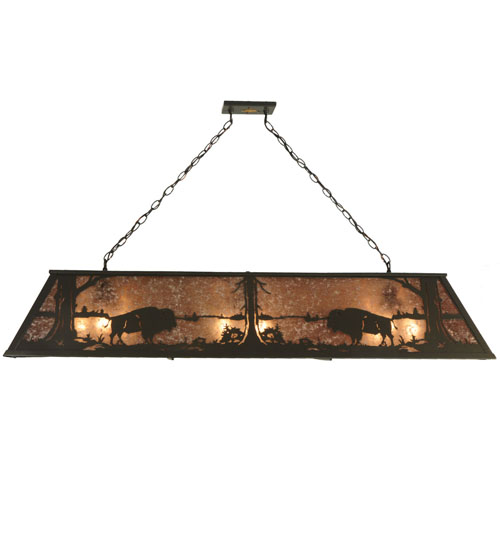 The natural charm of wildlife is captured beautifully with this striking pendant design featuring two young Buffaloes preparing to spar near a woodland lake while the early summer sun rises in the background. Ambient lighting evokes through a Silver Mica shade enhanced with a bottom diffuser to avoid direct visual exposure to harsh light bulbs. Decorative accents and hardware featured in a Timeless Bronze finish. Illuminate counters, islands, bars, and dining/billiard tables. Overall height ranges from 18 to 142 inches as the height can be adjusted in the field. Made to Order in our 180,000 square foot manufacturing facility in Yorkville, NY. Custom sizes, metal finishes and lamping available. UL and cUL listed for dry and damp locations.