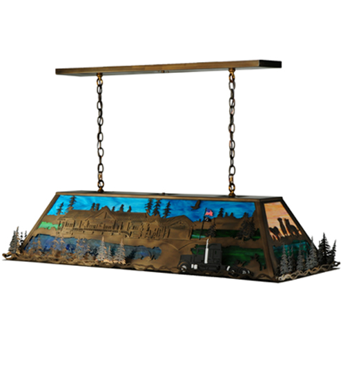 A stunning stained glass pendant is designed with a trailer truck cab, a garage, a cabin, and three dogs owned by The Tucker family and business. This personalized fixture features Antique Copper decorative accents on a stained glass oblong shade featuring a Blue sky and a Blue-Green lake in the background. This oblong pendant is ideal for illuminating billiard tables, bars, kitchen islands, counters, and dining tables. The overall height ranges from 18 to 75 inches, as the chain can easily be adjusted on location to your exact specifications. The Tucker's Oblong Pendant is included in the American-made, American-designed, handcrafted Personalized Collection and manufactured in Yorkville, New York. UL and cUL listed for dry and damp locations. Call us today, and we will add your business logo or family name to a lighting fixture for your next project. Please call for pricing and lead time.