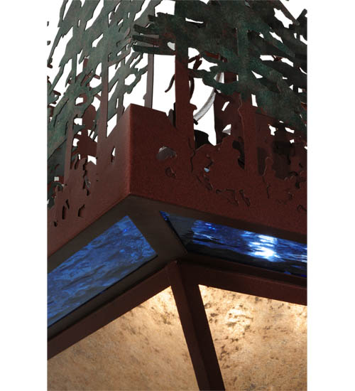You can almost smell the fresh clean scent of Pine with this lighting fixture; a nature inspired stand of Tall Pine trees handpainted in Green is depicted while the morning sun rises over a country lake. With soft ambient light projected beautifully through a Silver Mica shade topped with Blue Waterglass, this fixture is complemented with Rust finished accents and frame. Custom crafted by the hands of Meyda artisans in our manufacturing facility at the foothills of the Adirondack Mountain Lake Country here in the USA. Custom options are available. The fixture is UL and cUL listed for damp and dry locations.