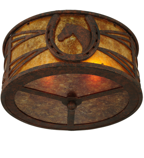 A horse portrait framed with a lucky horseshoe encircles this handsome ceiling fixture. Beautiful ambient light projects through stunning Amber Mica accented by a geometric design styled after fencing commonly found at horse stables. Decorative hardware, frame and accents are enhanced in a Rusty Nail finish. Perfect for game rooms, man caves and equestrian centers, as well as other residential and commercial spaces. Handcrafted by highly skilled artisans in the USA. Custom sizes, styles and colors are available. Energy efficient lamping options such as LED are offered. This fixture is UL and cUL listed for damp and dry locations.