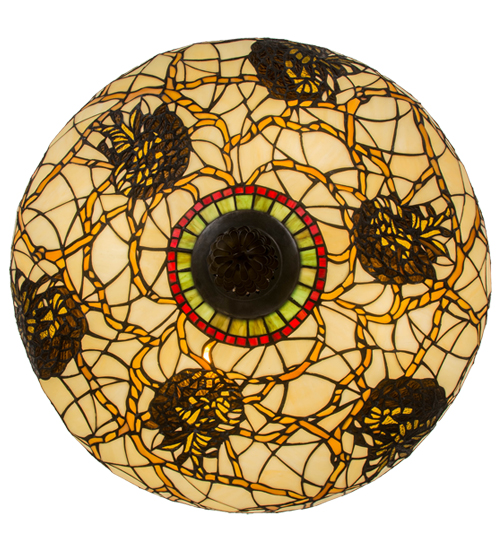 This stunning design features the iconic Pinecone, one of Mother Nature's most compelling organic symbols, which offers a natural elegance and represents the evolution of human enlightenment. Burgundy and Leaf Green bands edge this woodland shade that highlights Light Brown pinecones and Golden Sun branches on a Beige art glass shade. The art glass shade, which is created using Meyda Tiffany's famous copperfoil construction process, is enhanced with hardware finished in Antique Copper and complemented with a matching Pinecone accent. Custom sizes, styles and energy efficient lamping options such as LED are available.