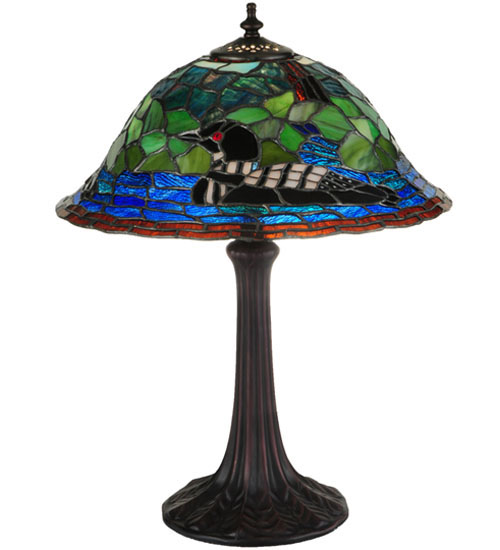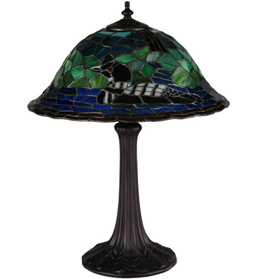 A Black and White Loon floats on sparkling Bluish Green waters beside Marsh Green grasses in stunning panels handcrafted utilizing stained art glass in a copperfoil construction. Leaf table lamp base featured in a Mahogany Bronze finish. Custom designs, colors and sizes available.