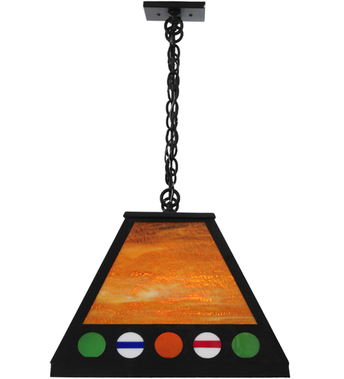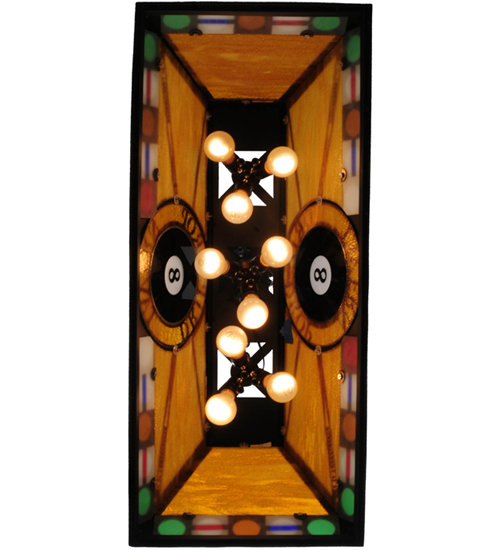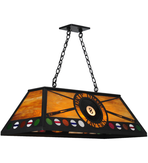This 8 Ball billiard oblong stained glass pendant is personalized with the Drip Drop Tavern name accented on a Honey glass background. The design features cue sticks and a border of various billiard balls including Red, Green, White and Orange. The hardware is featured in a bold Textured Black finish. The overall height of this pendant ranges from 25.5 to 72 inches as the chain length can be easily adjusted in the field to accommodate your specific lighting application needs. This personalized item is shown as an example of our craftsmanship and custom capabilities. It is not for sale 'as is.' Let us Put Your Name in Lights as we will customize this pendant with your business message and logo or family name.