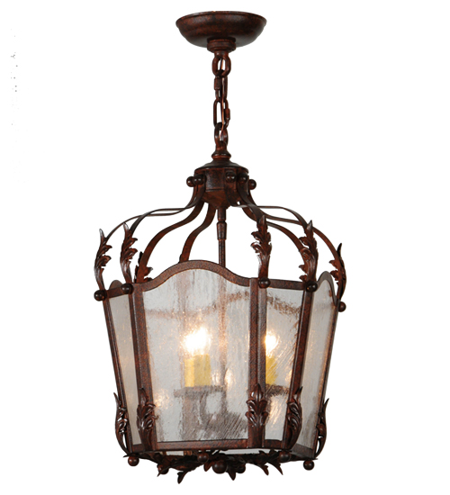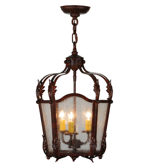 Utilizing a blend of timeless craftsmanship and classic design, the ever-popular Citadel brings home unsurpassed quality and shapely appeal. Evoking a dramatic effect, beautiful ambient light is evoked through Clear Seeded Glass which reveals a 3-light faux candelabra within this pendant. Citadel is enhanced with a dramatic design, stunning Acanthus leaf accents and frame featured in a Rusty Nail finish. The fixture is handcrafted by skilled artisans in our American factory in Upstate New York. Custom options include various sizes, colors, designs and dimmable energy efficient lamping. UL and cUL listed.